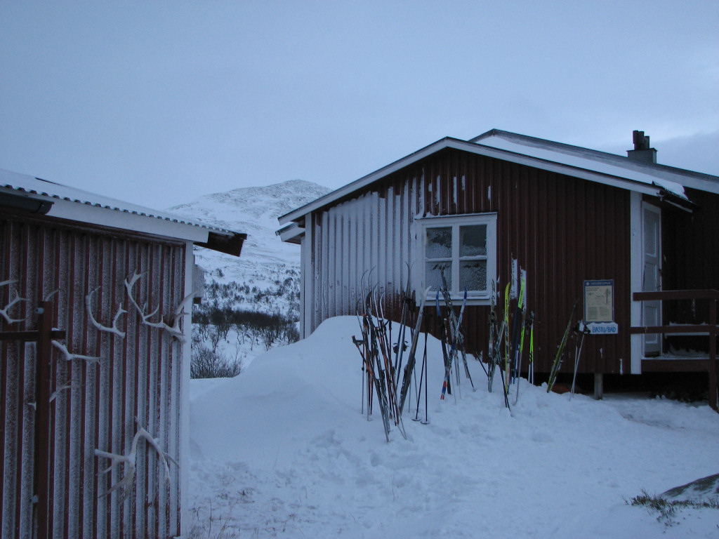 There were people going out to ski despite the weather, and the place did not in fact seem full. Karin, a colleague from the warden course, was inside, and after a brief chat I got to stay in a room containing a group of four who had had their food'n'stuff brought by snowmobile. I took it easy in the kitchen, where a few others were making food, while outside the snow and wind petered out considerably. After another talk with Karin a couple of children arrived, having sprinted on ahead of their adult counterparts, and the place was now filling up. The people who had been out for a while were also returning, and a shopping spree followed (not for me, though). I had some cheese'n'crackers to sustain me over the imminent sauna, and then read while I waited for the ladies' turn to end.