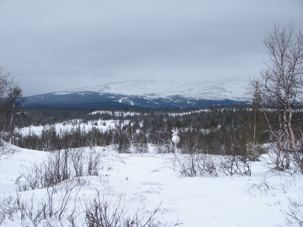 A number of people disembarked in Undersåker, but cars picked all but one up, so he and I waited inside the station building for the taxi-bus to arrive. The snow cover seemed reasonably good the first bit, then disappeared almost completely, causing some mild alarm, only to reappear around Östra Vålådalen. I filled my flask at the fjeld station, noting that a cold shifting wind had come into being, and there were clouds hugging the mountains. I walked down to the field where the main trails start, since the car road in between was bare, and started skiing after 09:30.