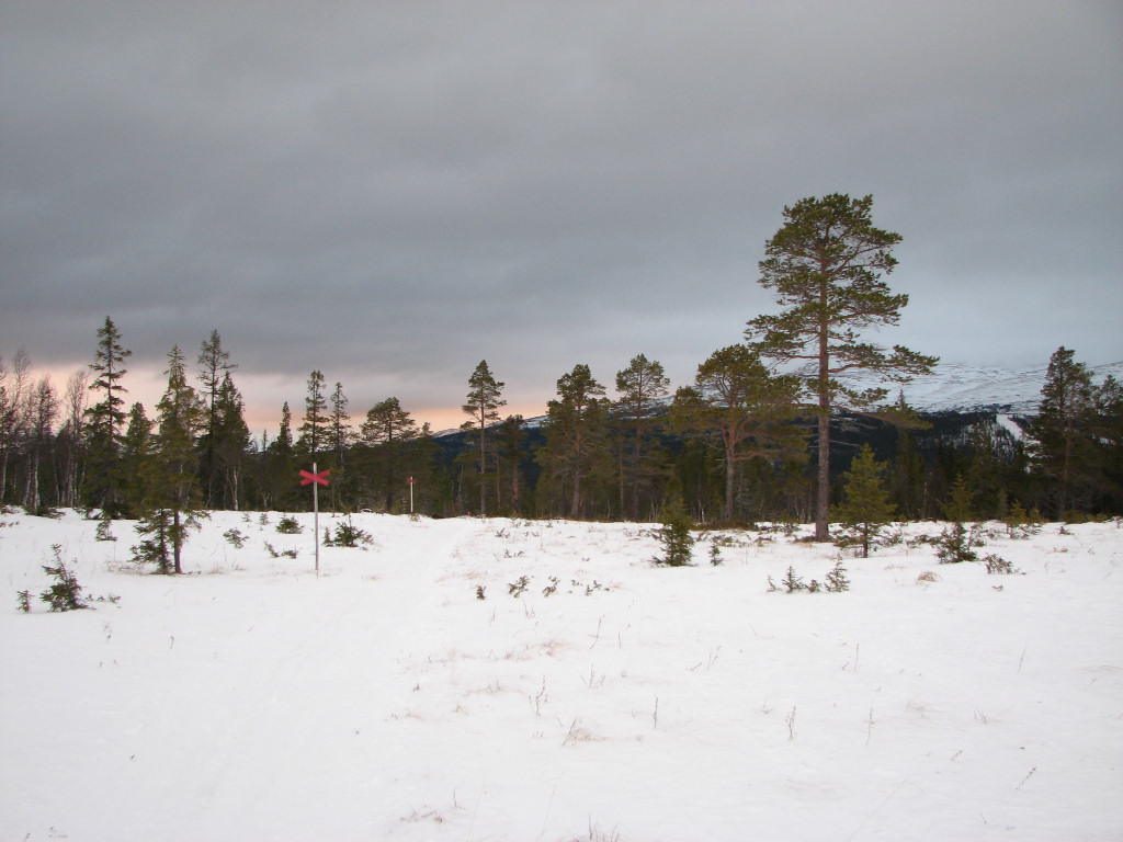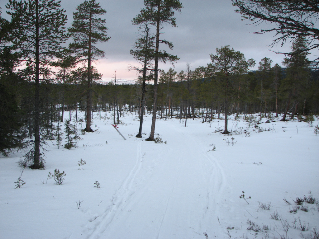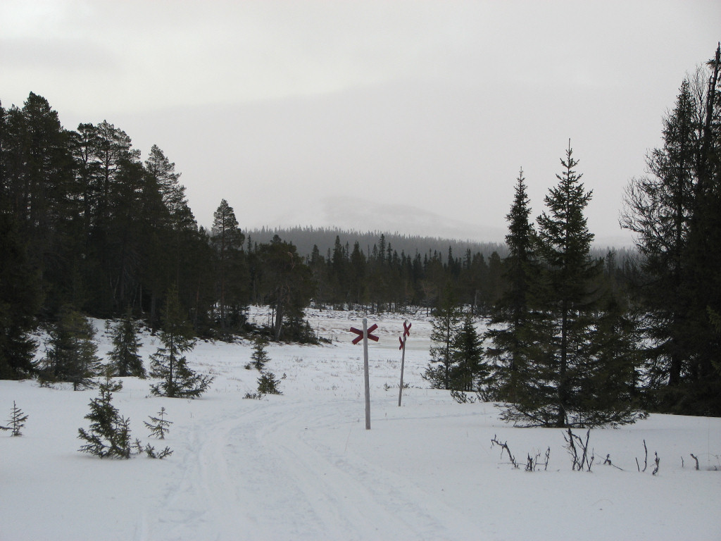 I thought I heard faint voices ahead, and immediately after I started moving again I came upon two women who relayed a message from Lunndörren: "It's quite full, so if you can and want to, feel free to continue to Vålåstugorna instead". Oh well, too late for that now. Out on the mires there were areas with ice that were easily circumvented, and soon more snow was brought by the increasing wind. I passed the next Grönvallen juncture, where the snow had started to cling to my skis, and stopped in a fairly sheltered portion of forest after a long stretch of mires after 11:30.