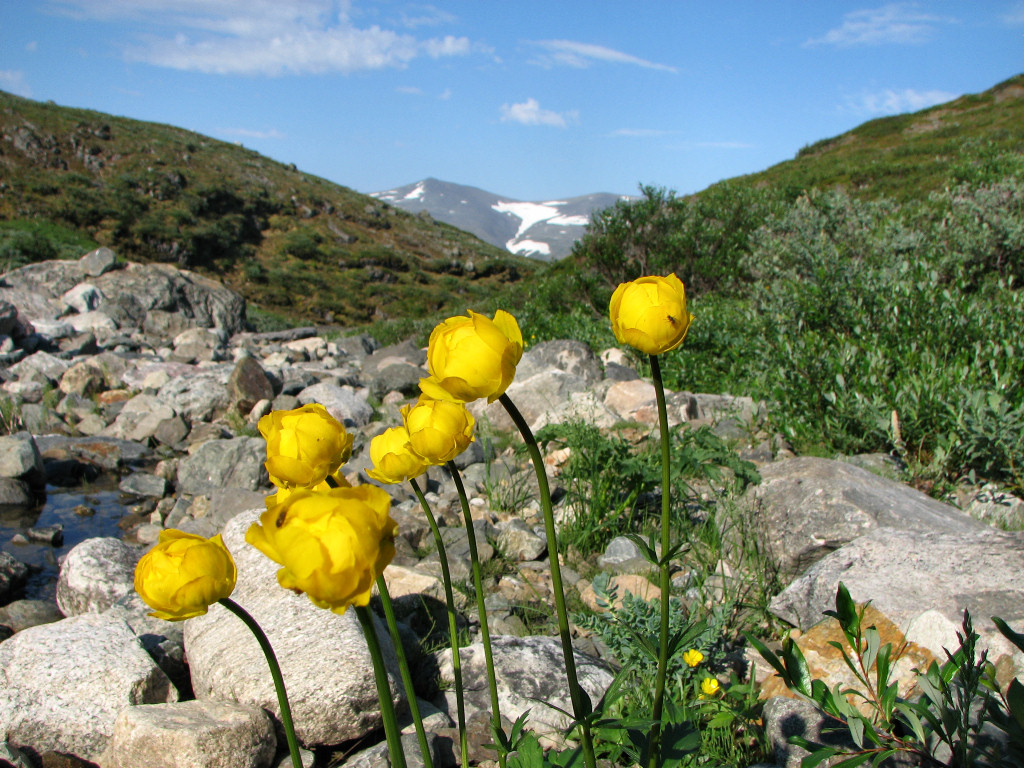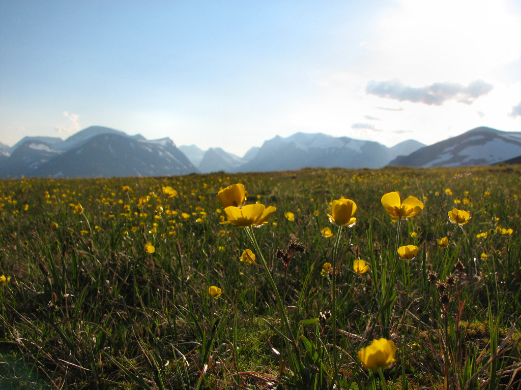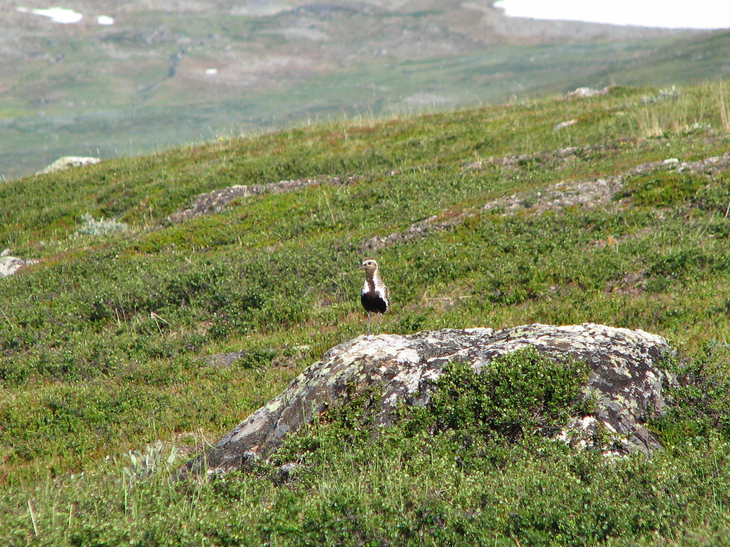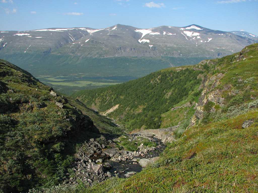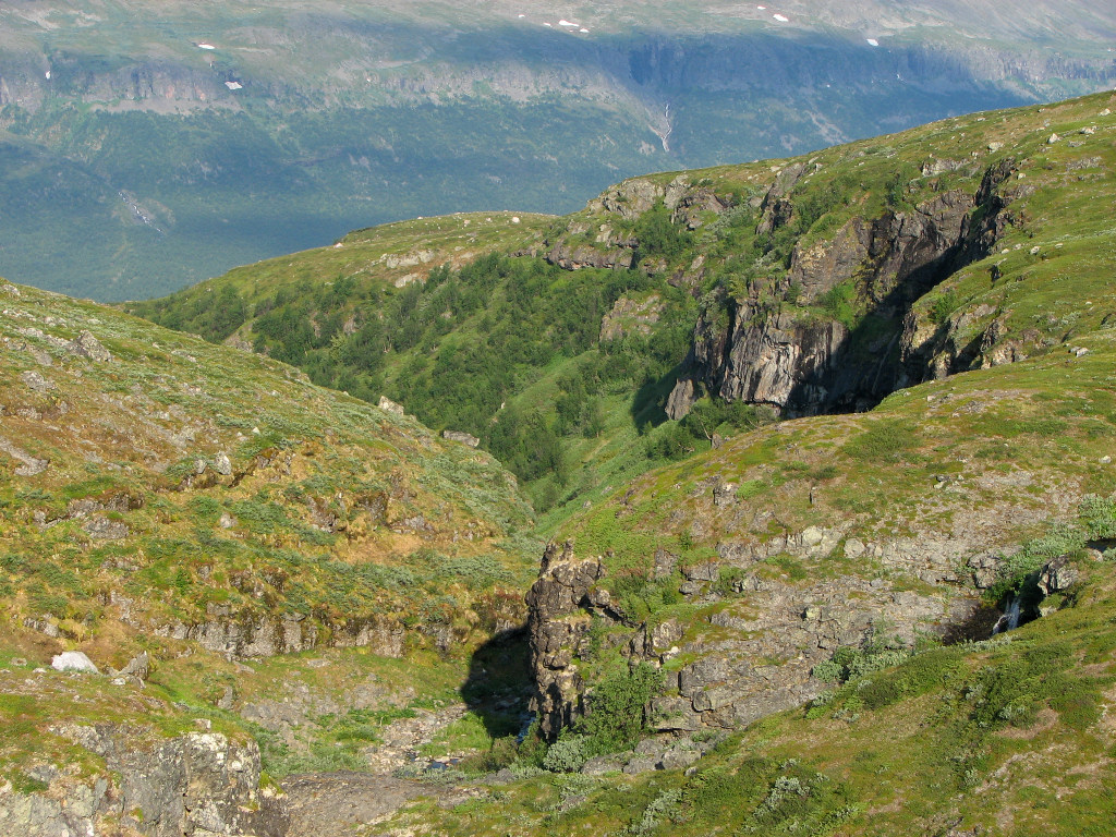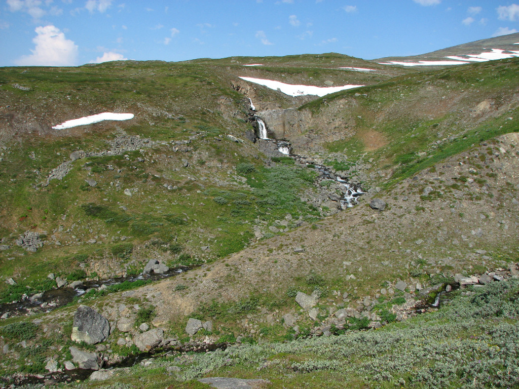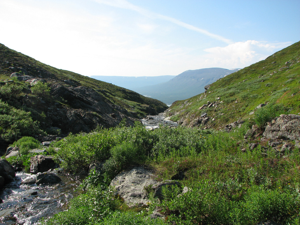 I crossed the stream right above the confluence, going out to the nearby edge to have a last look at Gaippugorsa. Here the terrain was very flowery, and walking was pleasant across the mostly open heath that played host to a higher-than-usual number of golden plovers underscoring my advance with their melancholic tones. I passed several shallow ravines containing the larger brooks running down this side of Visttasvággi, and it was only the last branch of the Márffigorsa one which held enough water to require some care, but it too was easily passed.