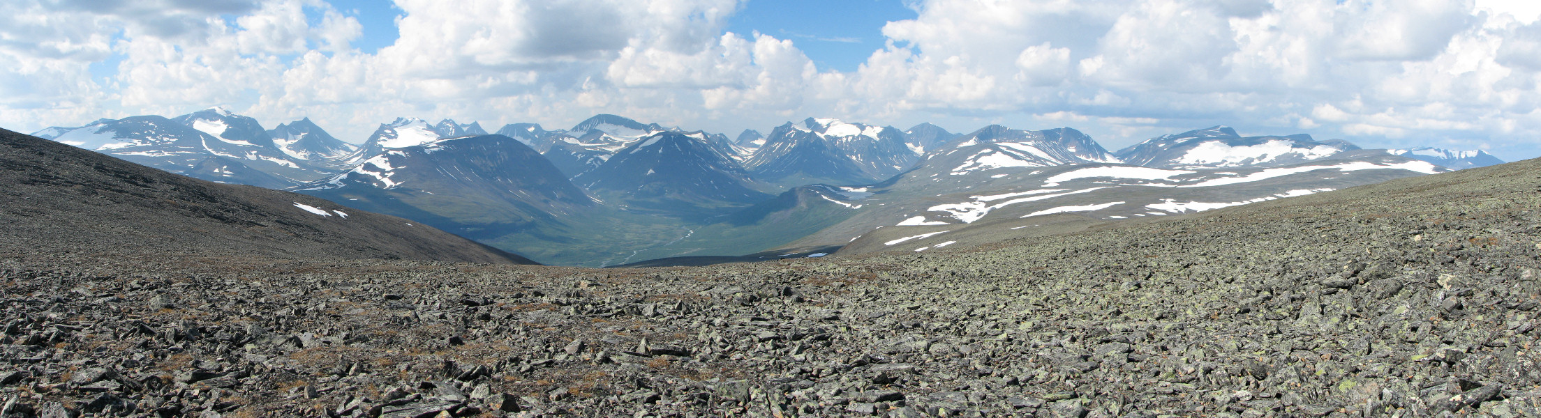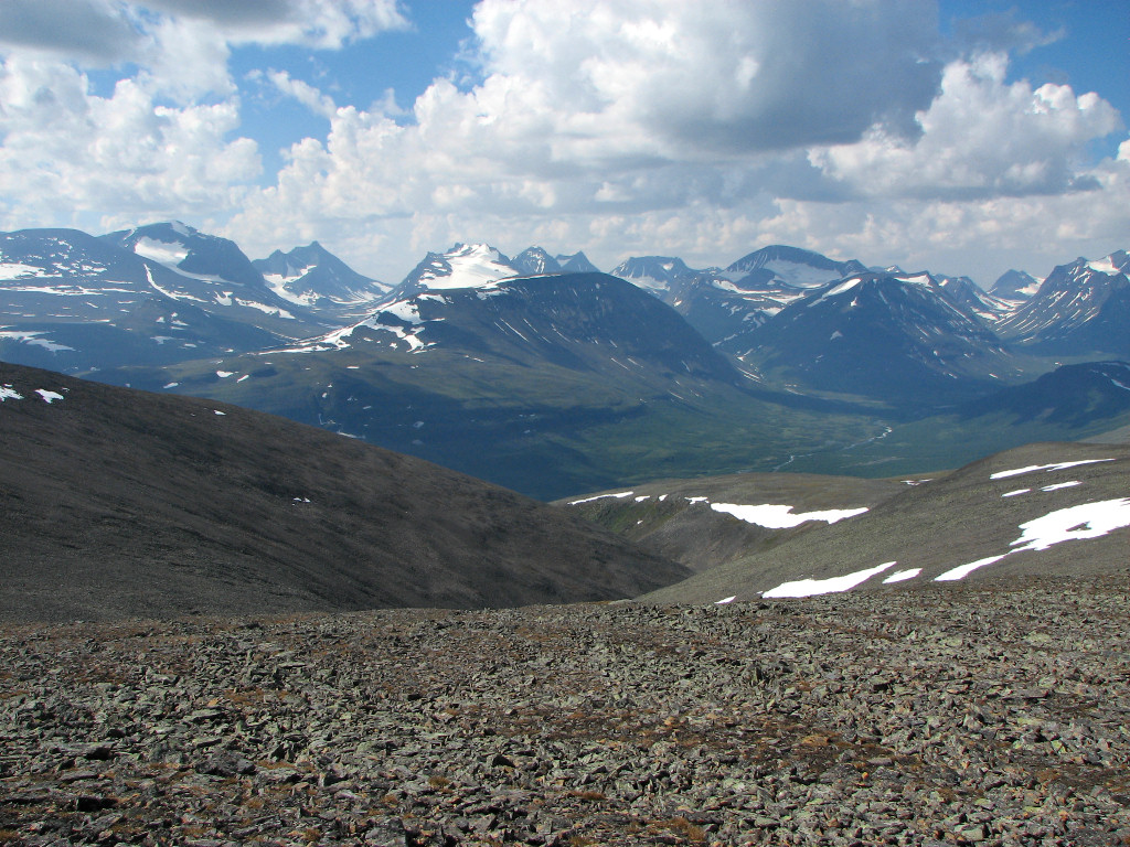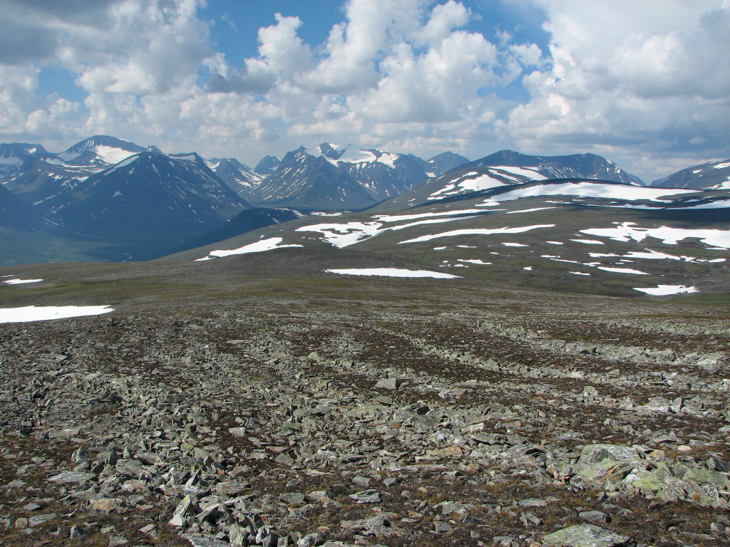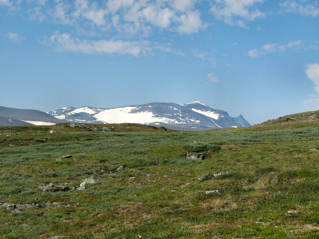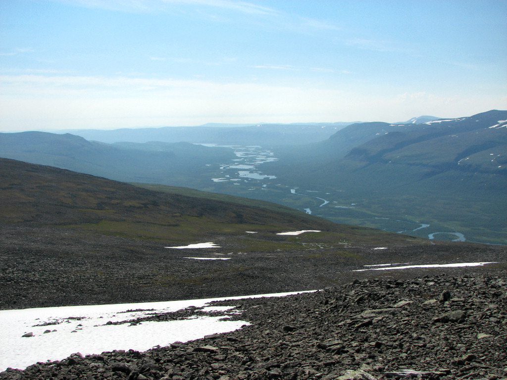 After a short pause I made my way up the other side zigzag fashion, which was easy enough albeit taxing, and then followed the gradually stonier terrain, utilizing a couple of well-oriented snowfields. I passed south of the summit of Roavičohkka where the ground was stonier, soon turning into actual rock fields that grew sparser as I descended to the saddle before Duopmačohkka.