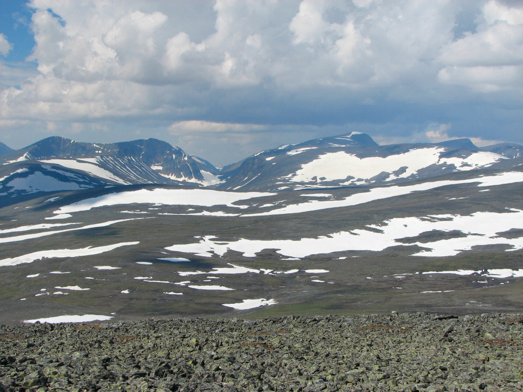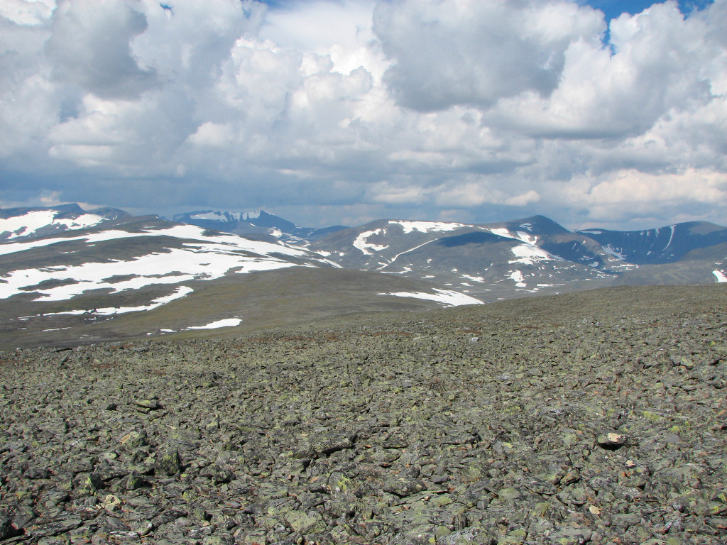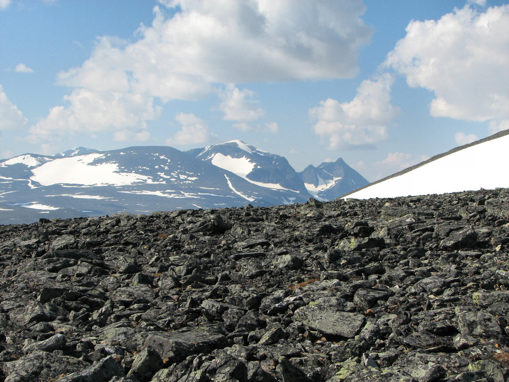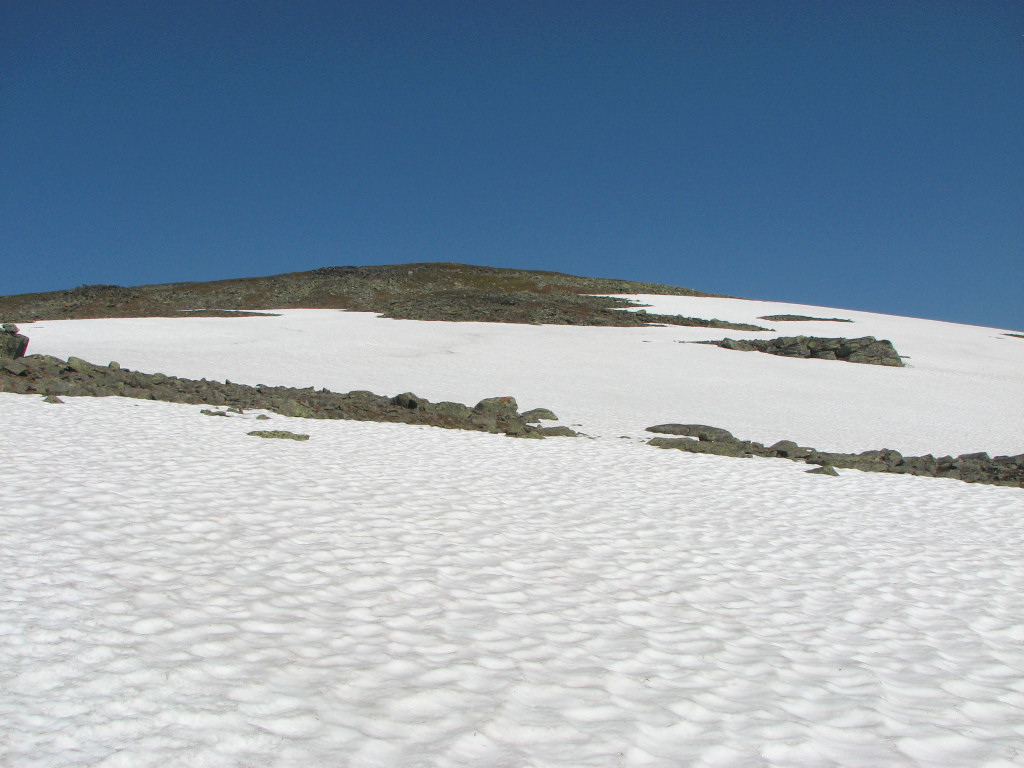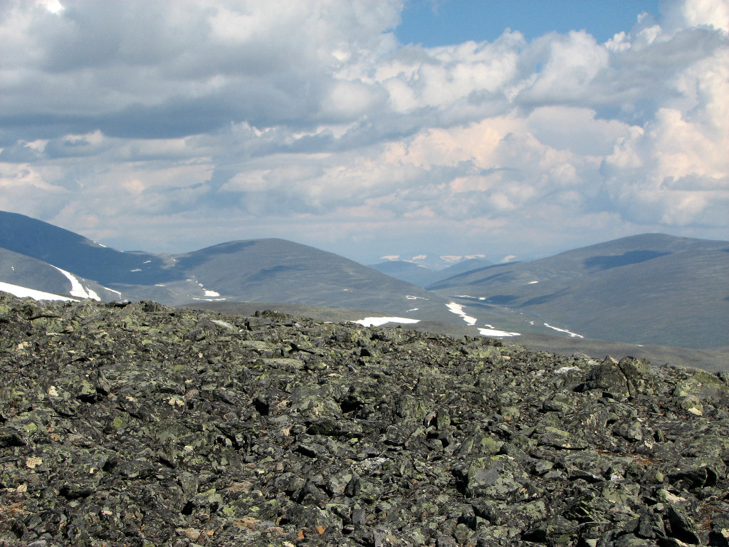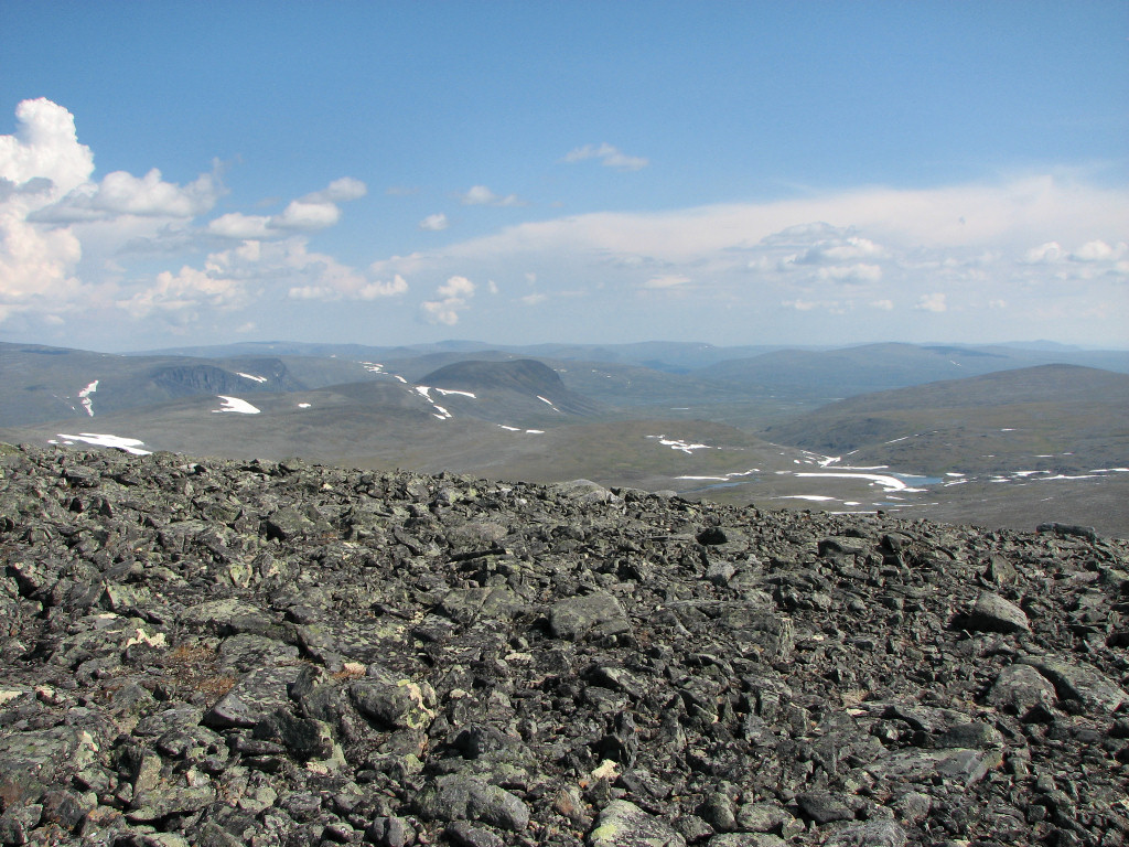 For the next portion up the latter fjeld it was back to rocks, but again a couple of larger snowfields facilitated my progress, even though the piercing reflected light had me squinting my eyes. Around here I noticed that the mosquitos and whatnot which had been my companions all day (but kept at bay by my repellant) were now gone, and there was a bit of wind to boot. Higher up the rocks decreased in size, covering undulating terrain which caused some course corrections for ease of walking, and it was not too long before I had reached the crest of the southeastern corner of the main rise at 11:30. Here I walked over to a larger rock by which I intended to have lunch, took off my rucksack...