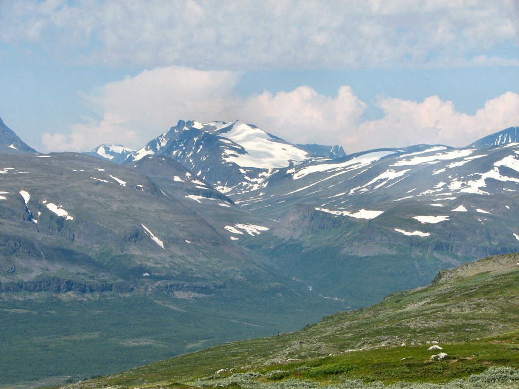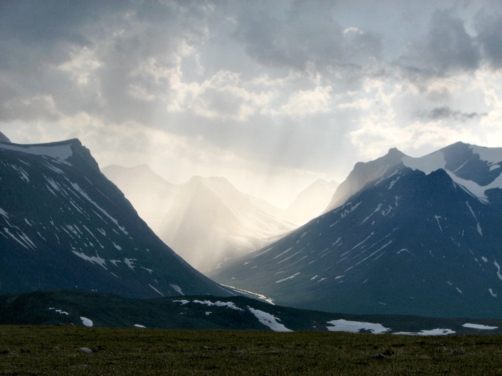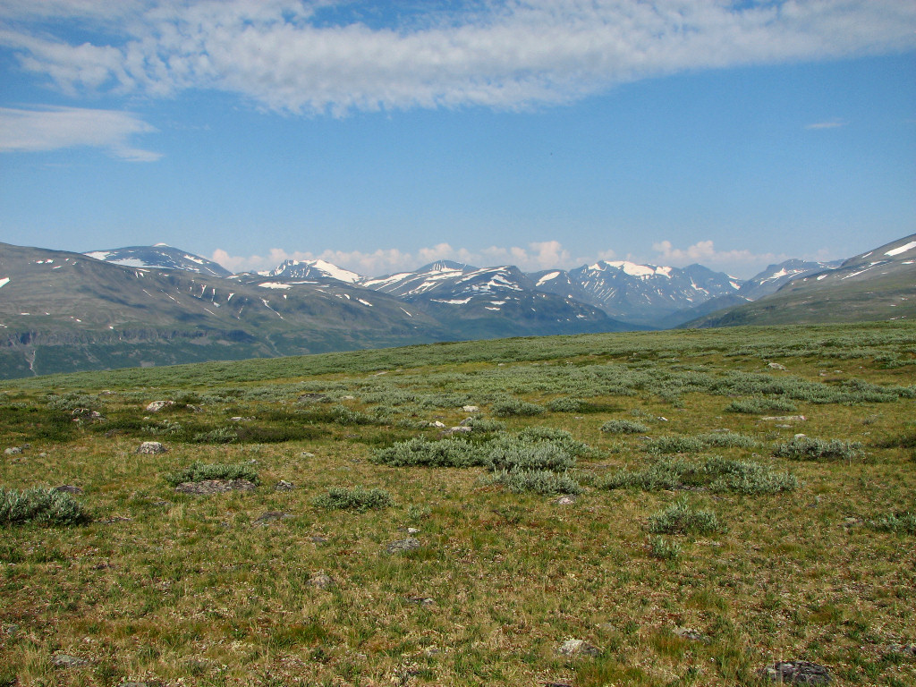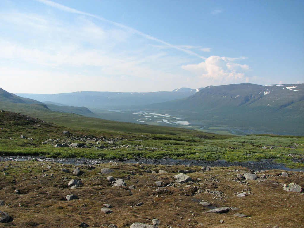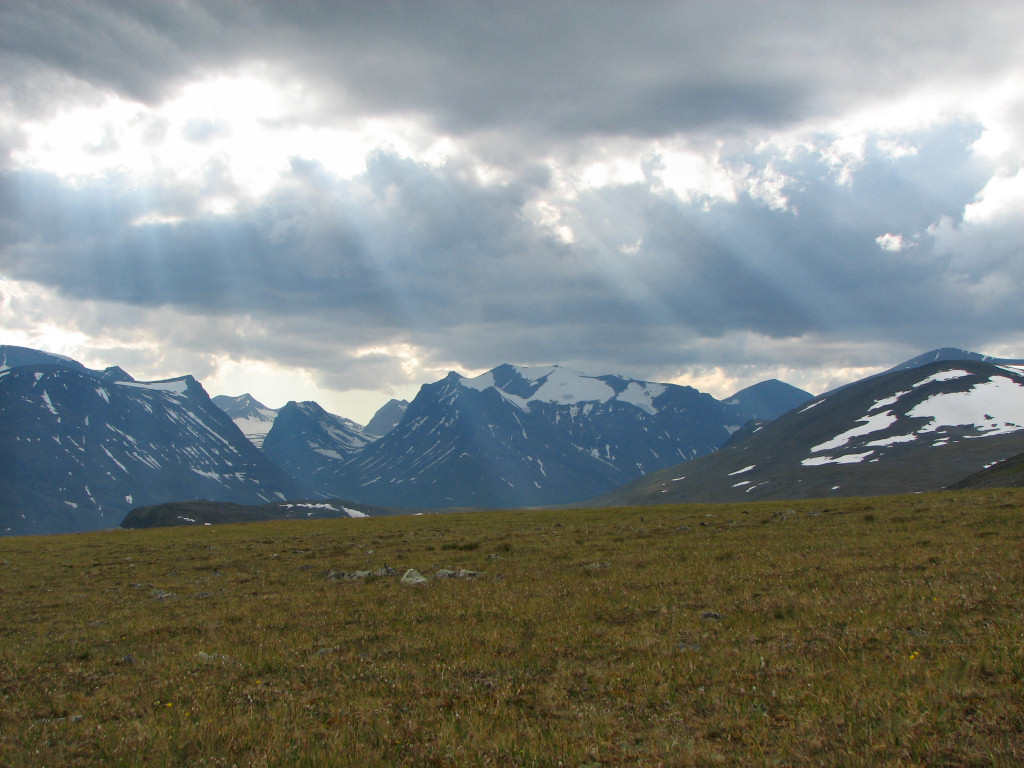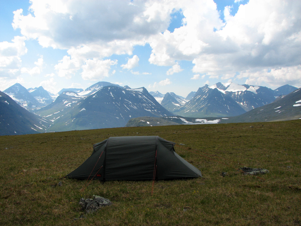 It was about 14:30 when I started to put up the tent, finding it difficult to judge what the wind was up to. The northern thunder had moved off, but a heavy shower was currently dumping its load over Nikkaluokta, and there was more of the same off in that direction. After a change of clothes I sat outside for a while before entering the tent, and not too long thereafter the first drops started falling. There was more thunder, but it kept its distance this time, even though the heavier rain did not. I spent the time doing crosswords and resting, and when the sun broke through I went out to tighten the guylines.
