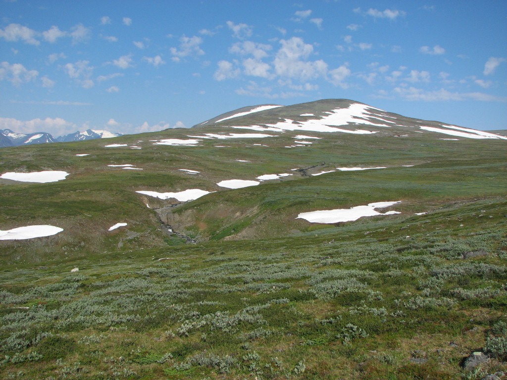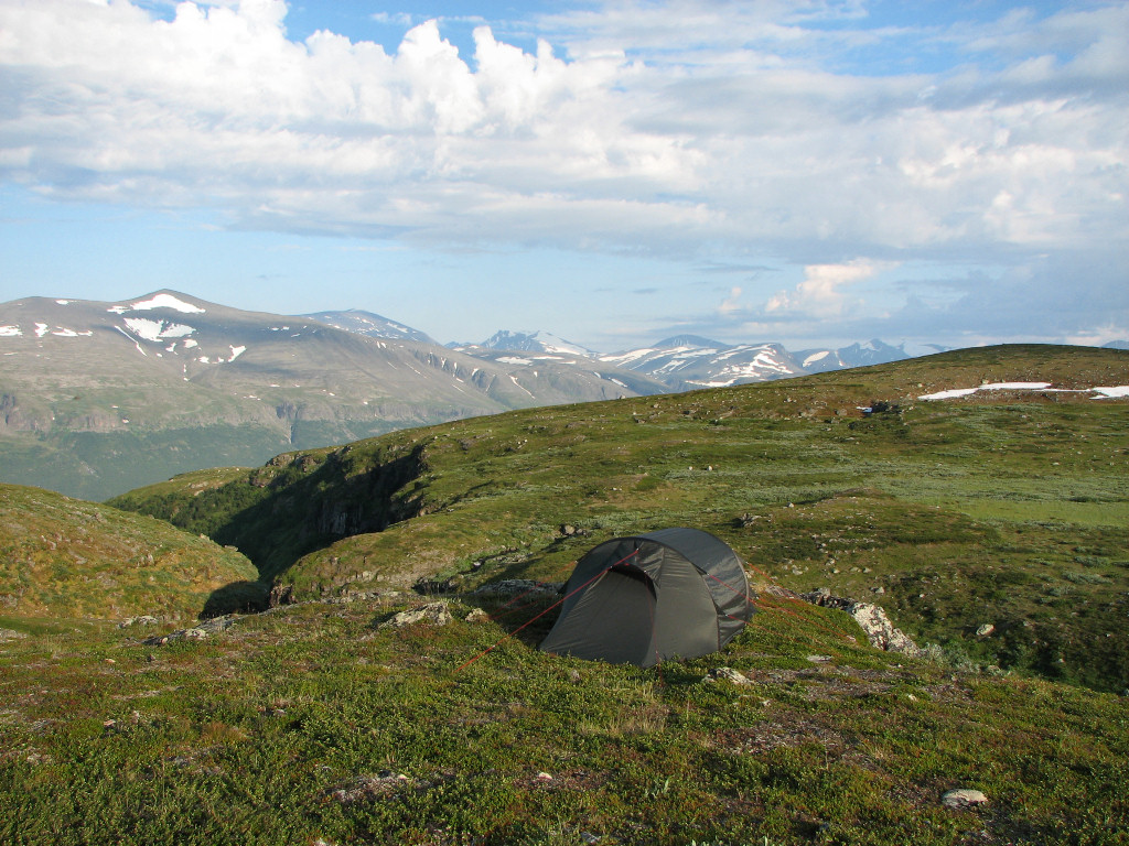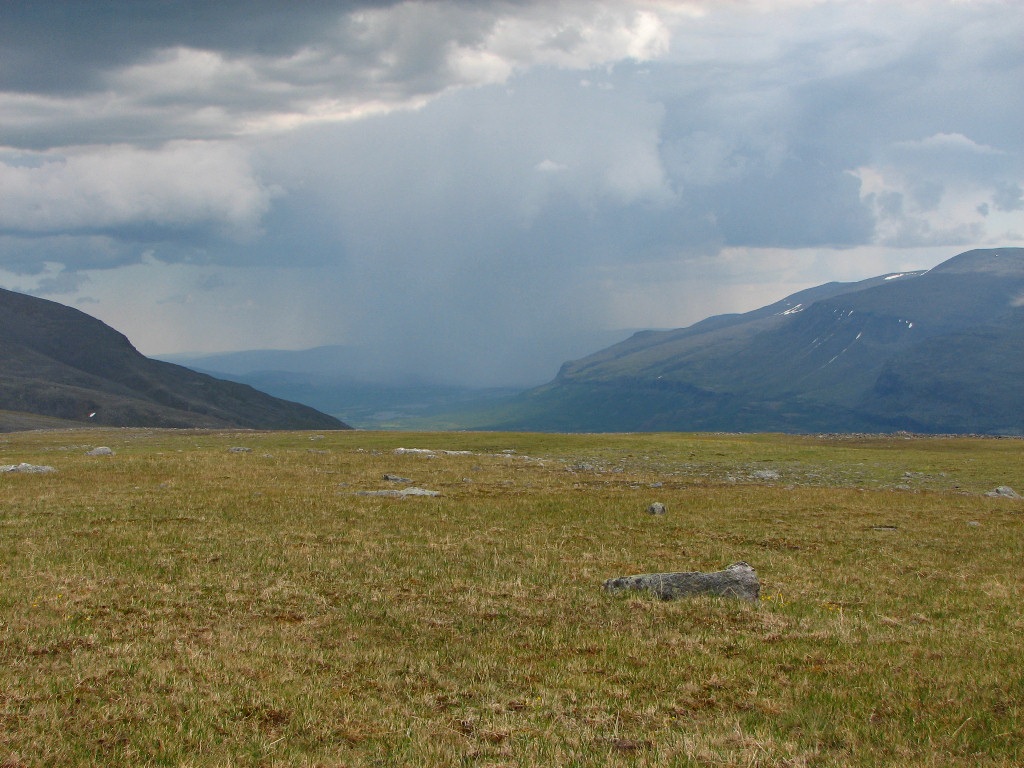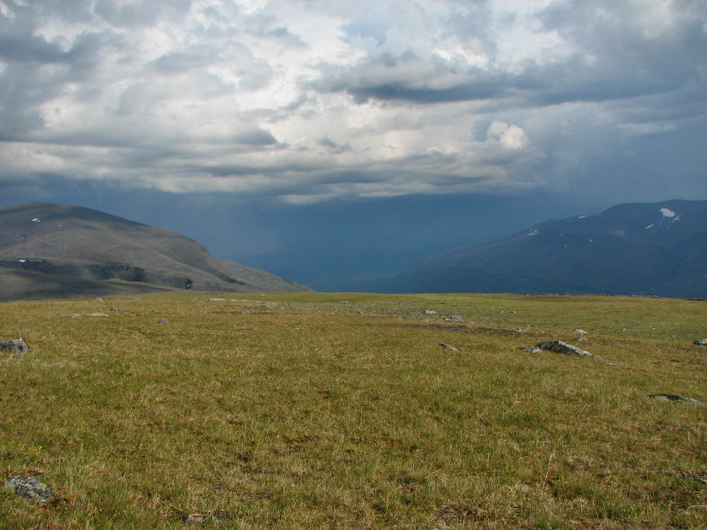 The first arm of the stream at the bottom had a snowfield covering it, and the second was wide enough to offer no resistance. Now the thunder was directly north of my position, and I could see the accompanying rain behind Vierročohkka. I went up the gentle slope on the other side, heading westwards, where the ground was easily trodden. Now the clouds were starting to reach the sun, and I felt the approach of the northern darkness, but there only came a few drops as I neared the first ravine in my path. I came to it a bit lower than desired, but a snowfield made the crossing an easy one. The next ravine also held a fair bit of snow, and I had to go down a short distance to circumvent a section that was too steep – and in so doing scared up a hare from its lair (rhyme of the day). I now found myself on the flat outrunner that was my intended goal of the day, and started examining the ground. It was all grass, but there was a slight slant to it and some of it was on the wet side, but I quickly found a very agreeable spot in close proximity to a small brook, with a very appealing backdrop.