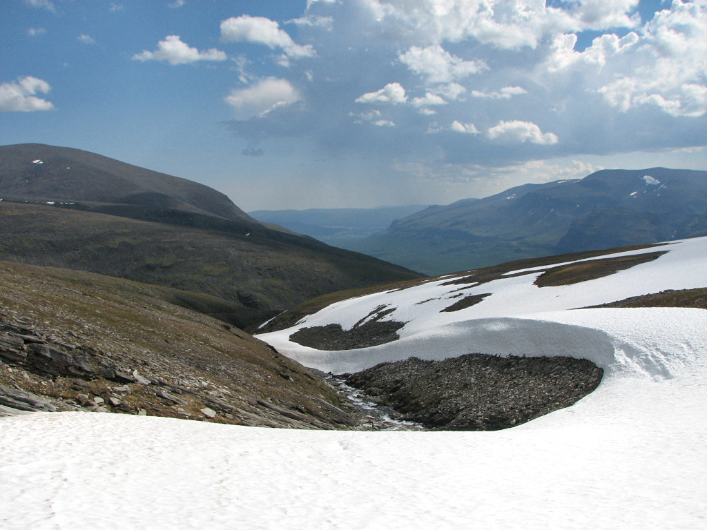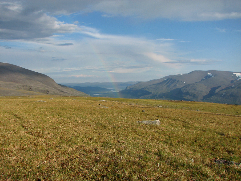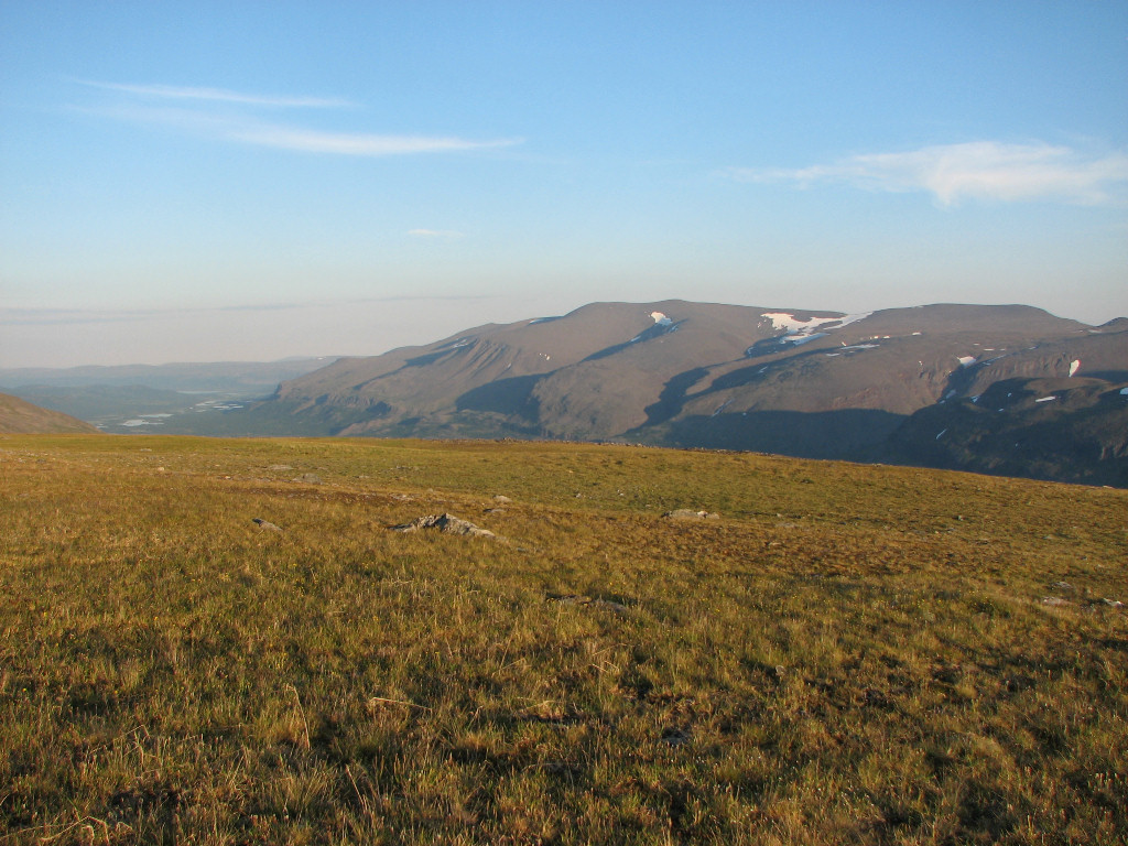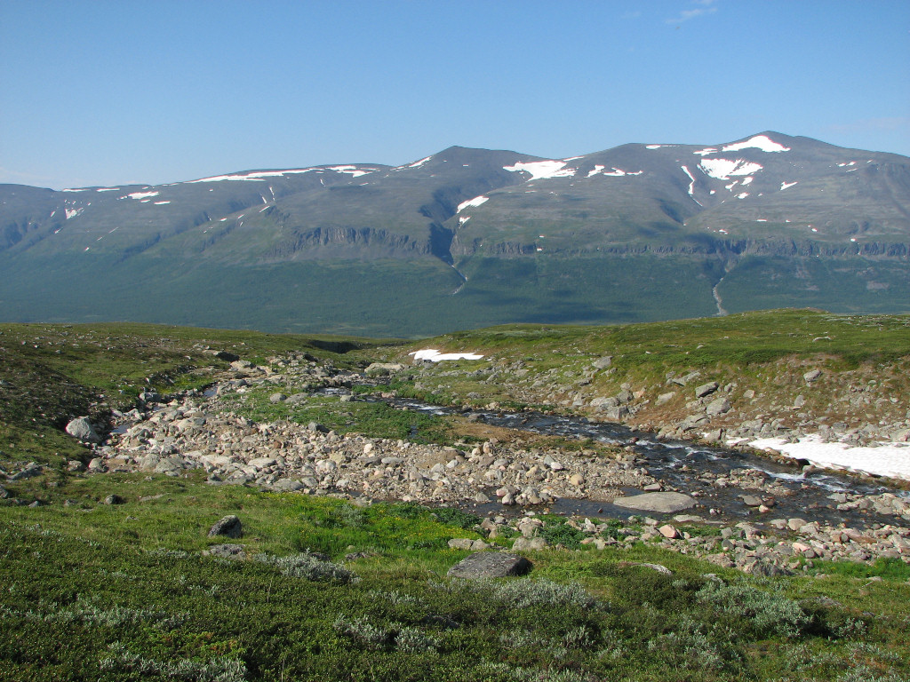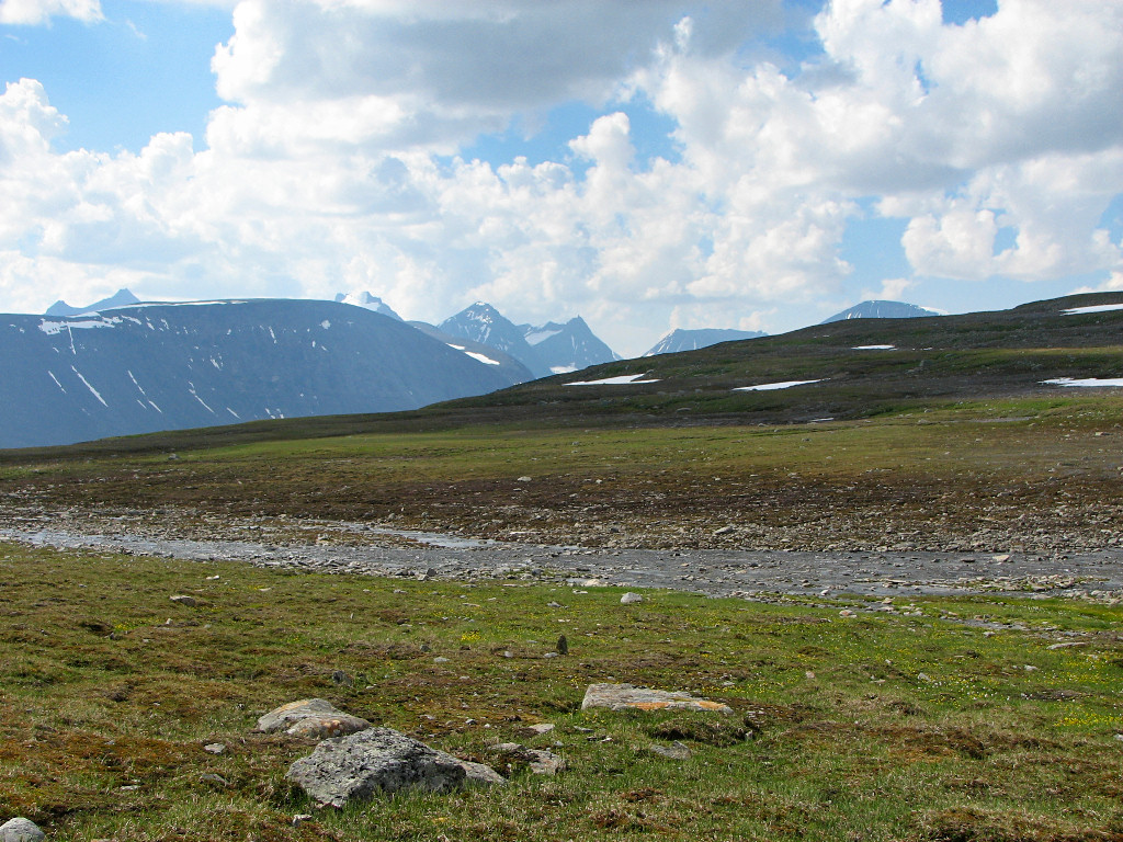 The first arm of the stream at the bottom had a snowfield covering it, and the second was wide enough to offer no resistance. Now the thunder was directly north of my position, and I could see the accompanying rain behind Vierročohkka. I went up the gentle slope on the other side, heading westwards, where the ground was easily trodden. Now the clouds were starting to reach the sun, and I felt the approach of the northern darkness, but there only came a few drops as I neared the first ravine in my path. I came to it a bit lower than desired, but a snowfield made the crossing an easy one. The next ravine also held a fair bit of snow, and I had to go down a short distance to circumvent a section that was too steep – and in so doing scared up a hare from its lair (rhyme of the day). I now found myself on the flat outrunner that was my intended goal of the day, and started examining the ground. It was all grass, but there was a slight slant to it and some of it was on the wet side, but I quickly found a very agreeable spot in close proximity to a small brook, with a very appealing backdrop.