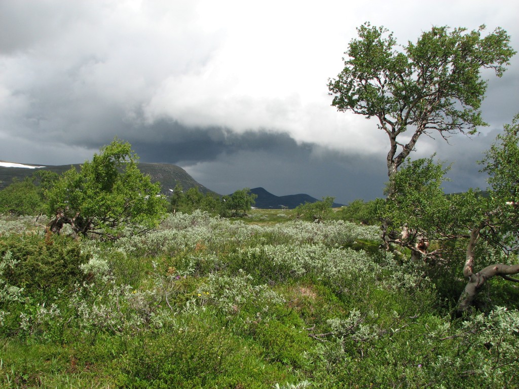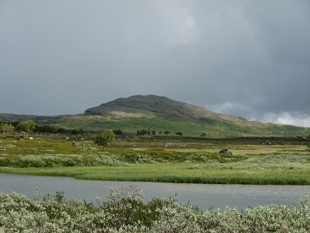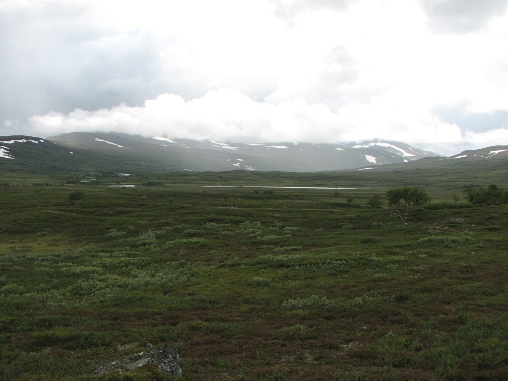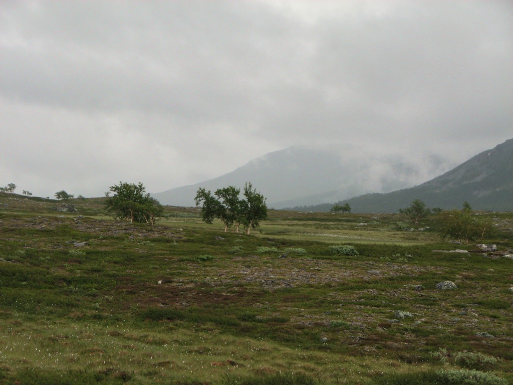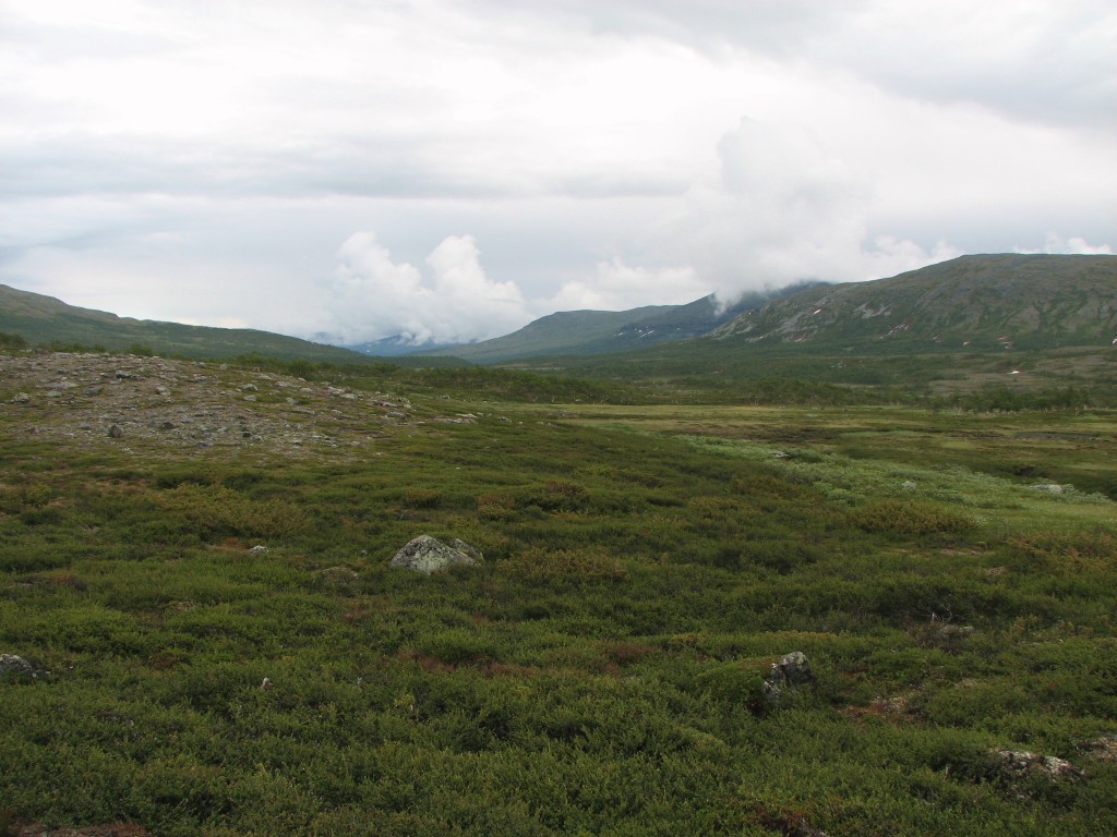 Since I had a time to meet I was not at full liberty to make extensive attempts either, and to add insult to injury the top section of the rod broke while I was at it. So it was with some sorrow that I resolved to cut the line, but I had a mind that the situation could be salvaged at a later time, so I tied the end to a bush on the shoreline for later recovery. I then started the walk back, going straight up at first and then aiming for Vålåvalen, circling some wet parts before coming onto high heath, while off to the west another haze was forming. Eventually I came upon the Lunndörren trail which I followed back home, returning before 15:45 in a slight drizzle that had sprung into being once more.