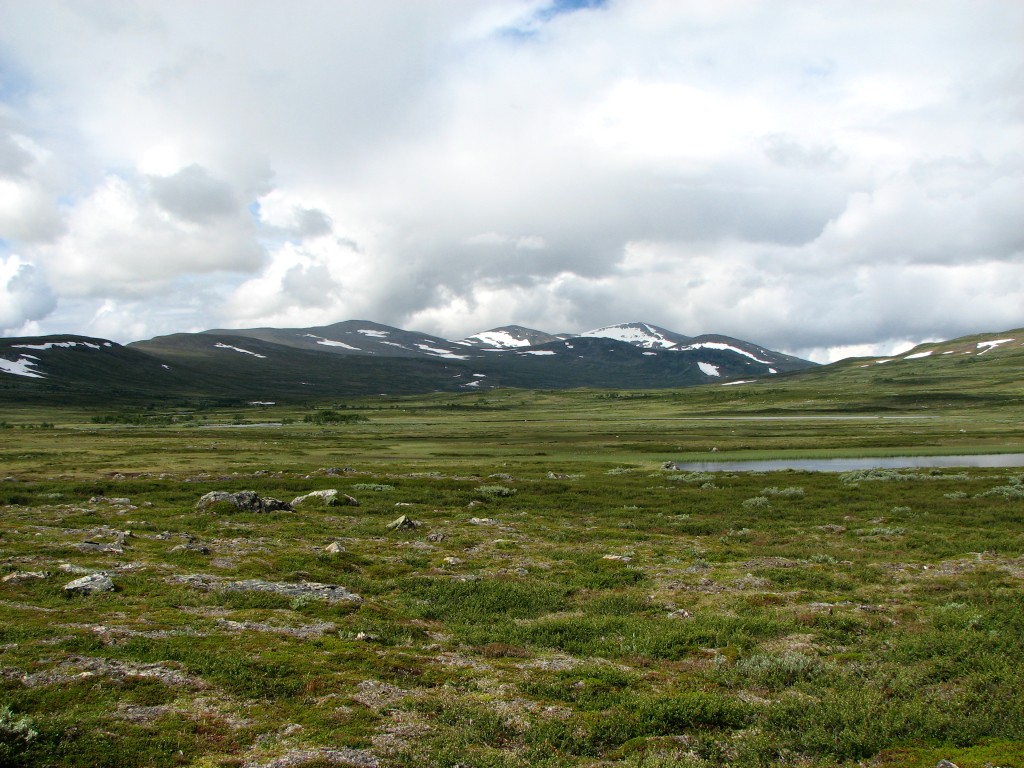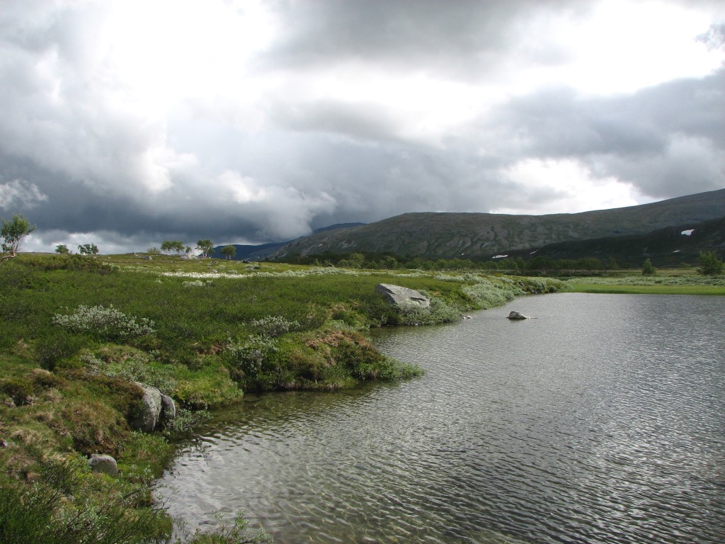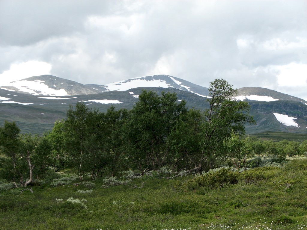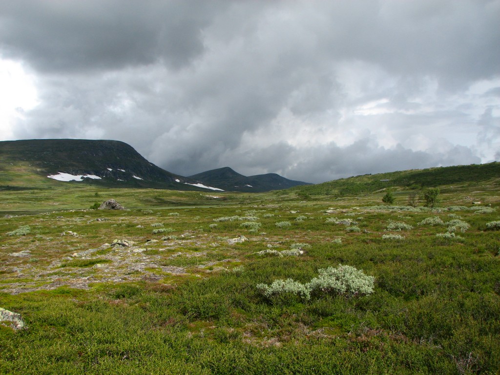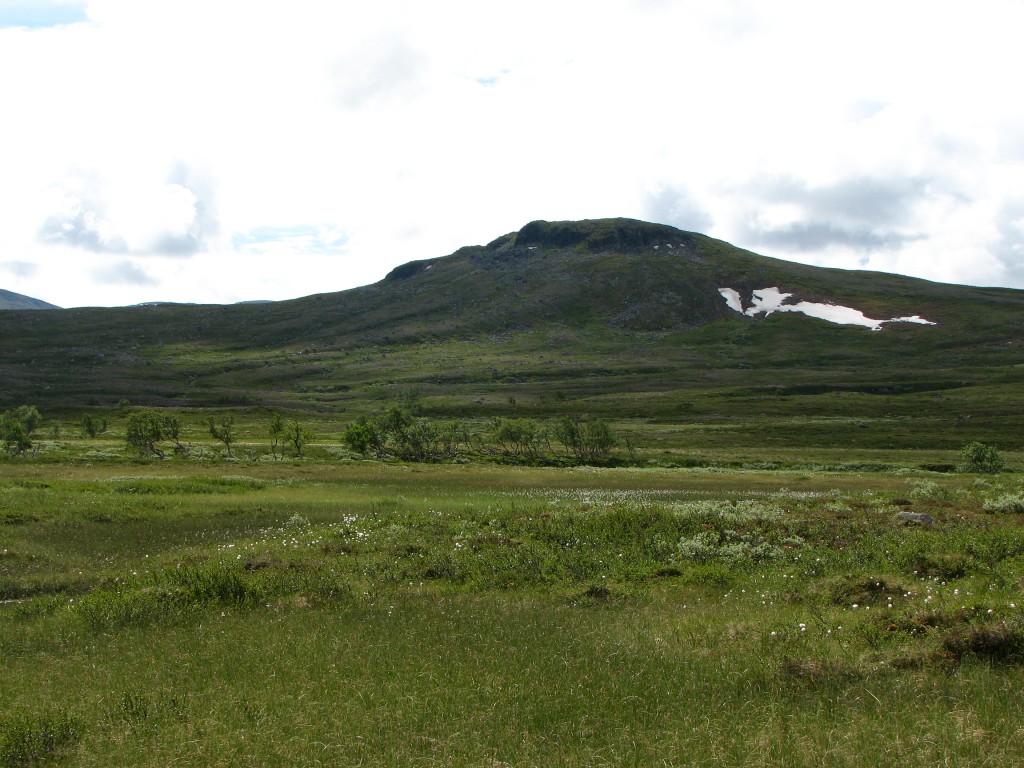 Since I had a time to meet I was not at full liberty to make extensive attempts either, and to add insult to injury the top section of the rod broke while I was at it. So it was with some sorrow that I resolved to cut the line, but I had a mind that the situation could be salvaged at a later time, so I tied the end to a bush on the shoreline for later recovery. I then started the walk back, going straight up at first and then aiming for Vålåvalen, circling some wet parts before coming onto high heath, while off to the west another haze was forming. Eventually I came upon the Lunndörren trail which I followed back home, returning before 15:45 in a slight drizzle that had sprung into being once more.